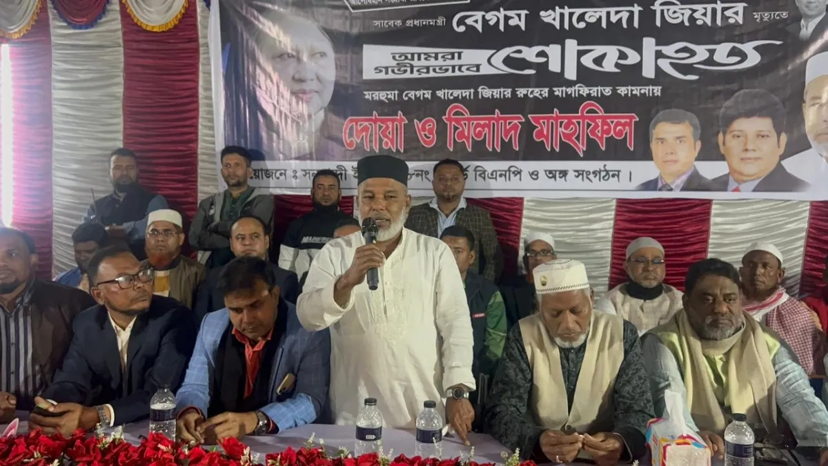 বেগম খালেদা জিয়ার রুহের মাগফেরাত কামনায় সনমান্দী বিএনপির দোয়া মাহফিল অনুষ্ঠিত ১৮ জানুয়ারি রবিবার সনমান্দী ইউনিয়ন এর ৮ নং ওয়ার্ডের বাংলাবাজার এ দোয়া মাহফিল অনুষ্ঠিত হয়। সোনারগাঁ উপজেলা বিএনপির আইন বিষয়ক সম্পাদক এডভোকেট কে এম সুমন এর সঞ্চালনায় ও সনমান্দী ইউনিয়ন বিএনপির সভাপতি সাফির উদ্দিন মজনু সভাপতিত্ব করেন। অনুষ্ঠানে প্রধান অতিথি হিসেবে উপস্থিত ছিলেন নারায়ণগঞ্জ-৩ আসনে বিএনপির মনোনীত সংসদ সদস্য প্রার্থী আজহারুল ইসলাম মান্নান ও প্রধান বক্তা হিসেবে উপস্থিত ছিলেন সোনারগাঁও উপজেলা বিএনপির সাধারণ সম্পাদক মোশাররফ হোসেন। বিশেষ অতিথি হিসেবে উপস্থিত ছিলেন সোনারগাঁও উপজেলা বিএনপির সিনিয়র সহ সভাপতি নজরুল ইসলাম টিটু,সহ সম্পাদক আতাউর রহমান,এডভোকেট আব্দুর রহিম, আব্দুর রহমান,সাংগঠনিক সম্পাদক নিজামুদ্দিন, নারায়ণগঞ্জ জেলা যুবদলের সহ সাধারণ সম্পাদক মুশফিকুল ইসলাম মোহন সহ সনমান্দী ইউনিয়ন বিএনপি ও অঙ্গ সংগঠন এর নেতাকর্মীরা। নিউজ করে দেও ChatGPT said: নিশ্চয়ই। আপনার দেওয়া তথ্যের ভিত্তিতে পরিষ্কার ও প্রকাশযোগ্য একটি সংবাদ প্রতিবেদন করে দিচ্ছি— বেগম খালেদা জিয়ার রুহের মাগফিরাত কামনায় সনমান্দী ইউনিয়ন বিএনপির দোয়া মাহফিল অনুষ্ঠিত বাংলাদেশ জাতীয়তাবাদী দল (বিএনপি) চেয়ারপারসন ও সাবেক প্রধানমন্ত্রী বেগম খালেদা জিয়ার রুহের মাগফিরাত কামনায় নারায়ণগঞ্জের সোনারগাঁ উপজেলার সনমান্দী ইউনিয়ন বিএনপির উদ্যোগে দোয়া মাহফিল অনুষ্ঠিত হয়েছে। ১৮ জানুয়ারি রবিবার বিকেলে সনমান্দী ইউনিয়নের ৮ নম্বর ওয়ার্ডের বাংলাবাজার এলাকায় এ দোয়া মাহফিল আয়োজন করা হয়। অনুষ্ঠানে সোনারগাঁ উপজেলা বিএনপির আইন বিষয়ক সম্পাদক এডভোকেট কে এম সুমনের সঞ্চালনায় সভাপতিত্ব করেন সনমান্দী ইউনিয়ন বিএনপির সভাপতি সাফির উদ্দিন মজনু। দোয়া মাহফিলে প্রধান অতিথি হিসেবে উপস্থিত ছিলেন নারায়ণগঞ্জ-৩ আসনে বিএনপির মনোনীত সংসদ সদস্য প্রার্থী আজহারুল ইসলাম মান্নান। প্রধান বক্তা হিসেবে বক্তব্য রাখেন সোনারগাঁ উপজেলা বিএনপির সাধারণ সম্পাদক মোশাররফ হোসেন। বিশেষ অতিথি হিসেবে উপস্থিত ছিলেন সোনারগাঁ উপজেলা বিএনপির সিনিয়র সহ-সভাপতি নজরুল ইসলাম টিটু, সহ-সম্পাদক আতাউর রহমান, এডভোকেট আব্দুর রহিম, আব্দুর রহমান, সাংগঠনিক সম্পাদক নিজামুদ্দিন, নারায়ণগঞ্জ জেলা যুবদলের সহ-সাধারণ সম্পাদক মুশফিকুল ইসলাম মোহনসহ সনমান্দী ইউনিয়ন বিএনপি ও এর অঙ্গসংগঠনের নেতাকর্মীরা। শেষে বেগম খালেদা জিয়ার রুহের মাগফিরাত কামনা এবং দেশ ও জাতির শান্তি ও সমৃদ্ধি কামনায় বিশেষ মোনাজাত করা হয়।
